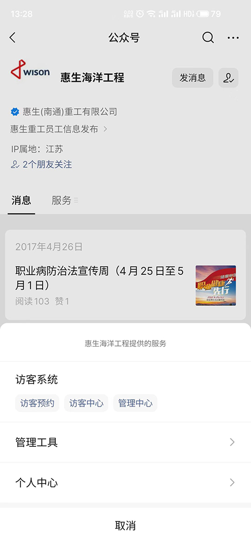 慧生海工采用的是樂臉通SaaS公有云解決方案,系統可對接該微信公眾號,為公眾號提供訪客預約入口和管理員入口,訪客拜訪公司在微信公眾號上進行預約,填寫個人信息和拜訪事由,提交給被訪單位審批,系統支持設置審批人和審批流程,審批通過,被訪人會獲得通行二維碼,訪客拜訪信息會保存到系統中,方便統計和查詢。